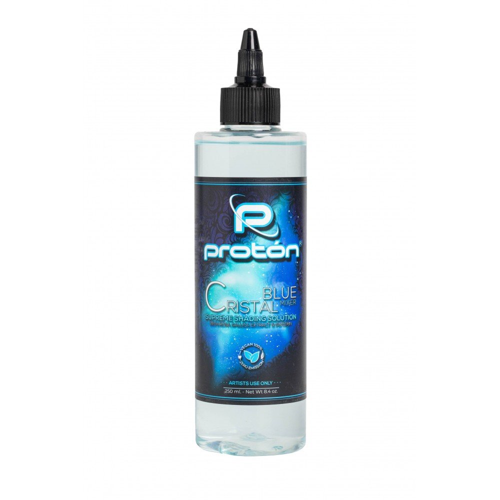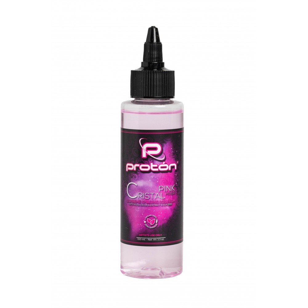 Proton Cristal Shading Solution is a professional cosmetic astringent solution, specifically developed to accompany the artistic process of tattooing. Its exclusive formula, based on traditional Colombian knowledge and entirely manufactured in Spain under strict sanitary controls, is designed to soothe the skin during the most demanding sessions.
